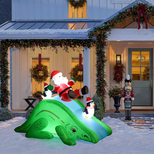 Santa and Penguins Trio Sliding on a Dinosaur Inflatable Holiday Decoration