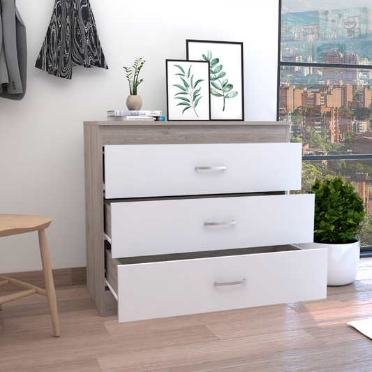 Three Drawer Dresser Lial, Superior Top, Metal Hardware, Light Gray / White Finish