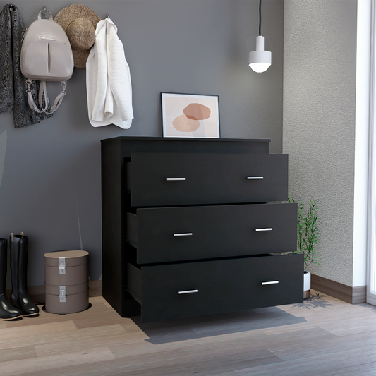 Three Drawer Dresser Whysk, Superior Top, Handles, Black Wengue Finish