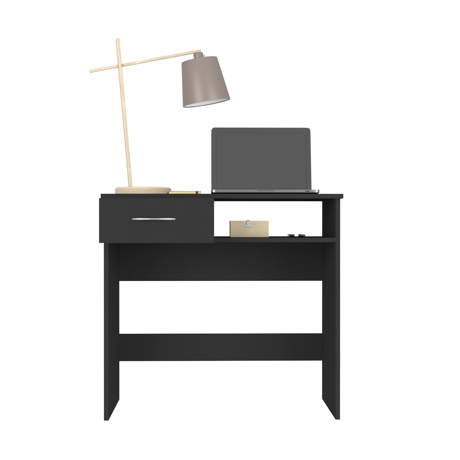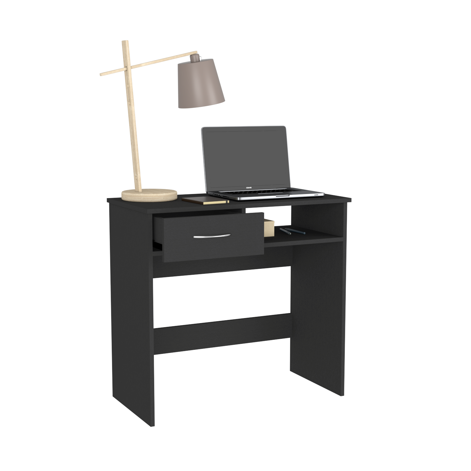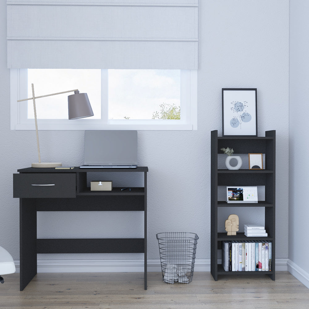 The Caldwell Home Office Set will allow you to work with laptops or monitors with enough space for keyboards and a mouse. It's a uniquely designed bookshelf that will give to your space a modern touch of functionality. Its compact yet spacious combo design that's perfect for a laptop workstation, desk, and bookcase combo, desk comes with one large drawer with a metal handle. Designed with Black manufactured wood.