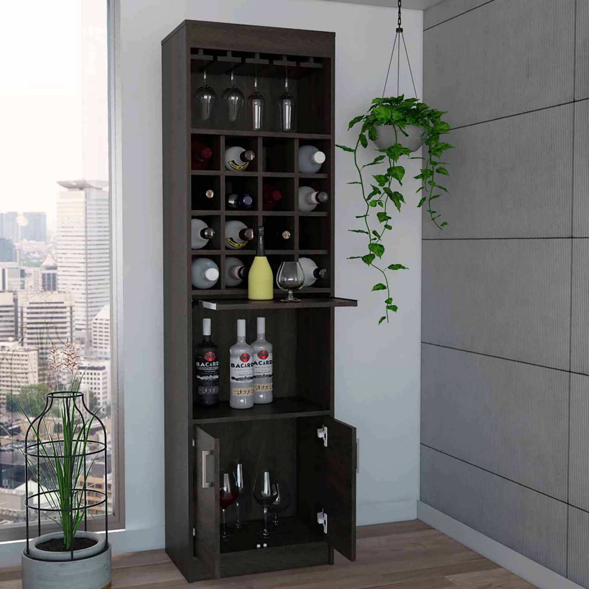 The Soria Bar Double Door Cabinet is the answer you were looking for to have a multifunctional, modern, easy-to-use, and great-looking piece to entertain your guests at your dinners, and the best thing is that it is a piece of furniture that adapts to any space easily. Its features entertain your guest with this spectacular 71" high bar cabinet, twelve wine glass rack, comes with a retractable and concealable serving tray to prepare your drink, and includes sixteen bottle liquor cubbies. Designed with elegant Carbon Espresso, Black Wengue, White, Smokey Oak, and Light Grey manufactured wood finish.