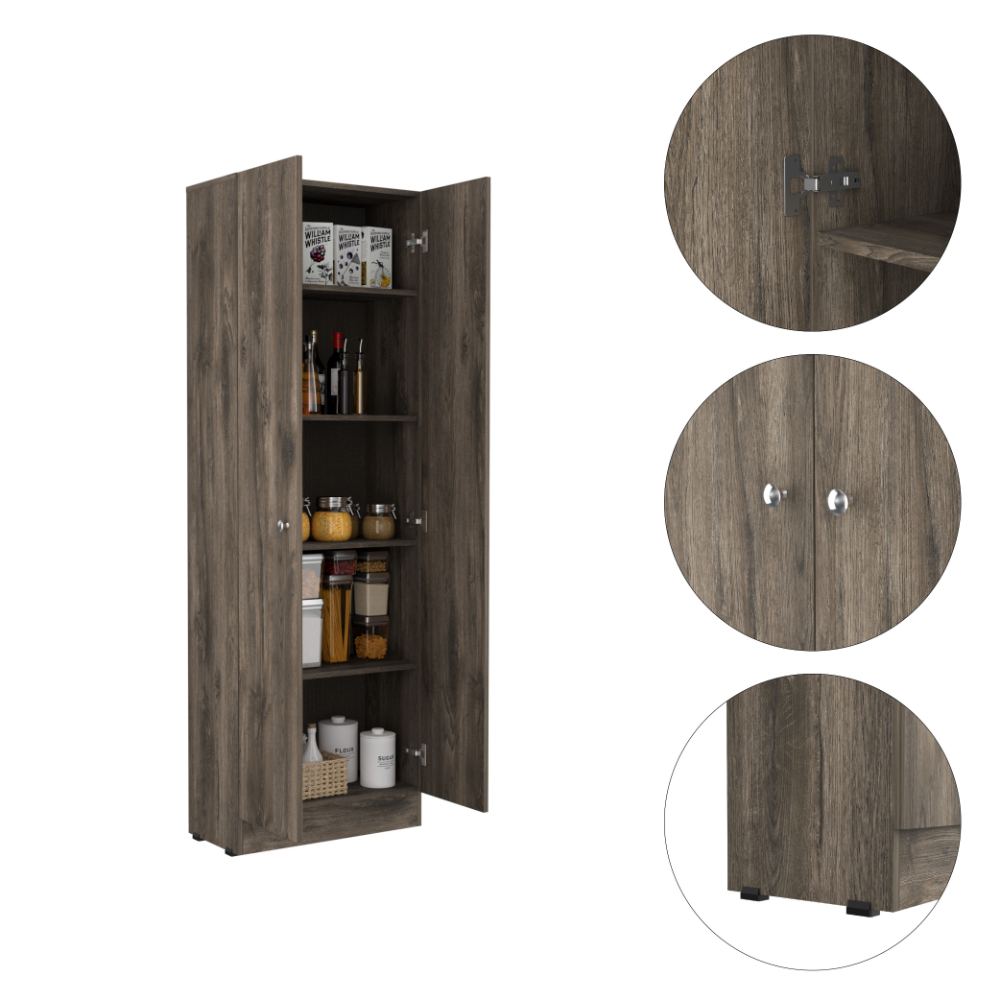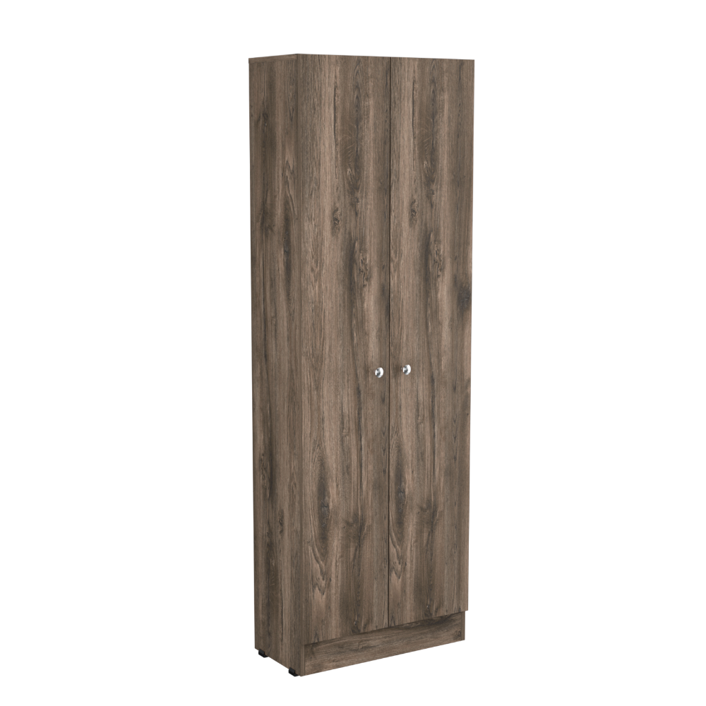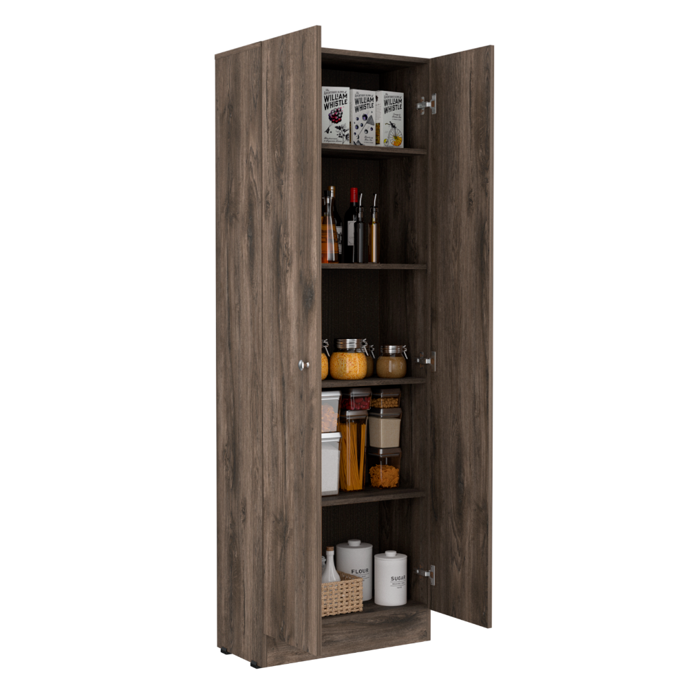 The Pipestone Storage Cabinet Forget about spending a long time searching for your cooking supplies because you can't remember where you put them. This product is easily into your kitchen, garage, or mudroom without getting in the way or taking up too much space. It features a tall cabinet with a high storage-space capacity (70"height X 23.6" width X 11,8" depth), perfect for covering your storage needs in a garage, utility room, living room, or kitchen, and five internal shelves (12.9" height X 22" width), the top one is a bit shorter than the rest, easy to assembly. Designed with elegant Dark Brown manufactured wood finish.