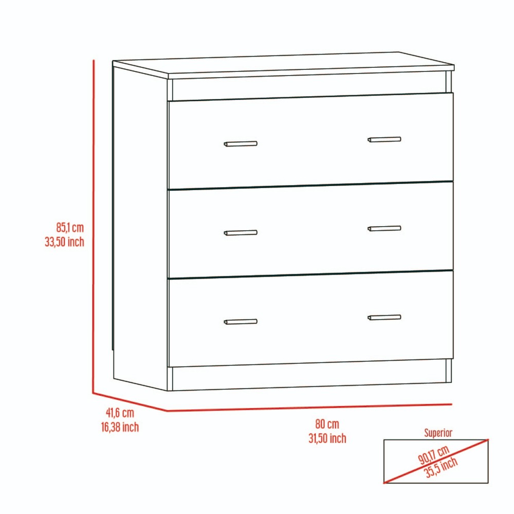 Whysk Three-Drawer Dresser, this piece is part of a new and limited-edition classic series. It is a beautiful extra storage space for your clothing, books, or anything you choose, with a modern touch with its metal hardware and spacious three-drawer design (27.95''W X 23.2''H); moreover, its Superior Top (35,5'') is perfect for customizing it in your way with your favorite decorations. Designed with elegant light gray, and white manufactured wood finish.
