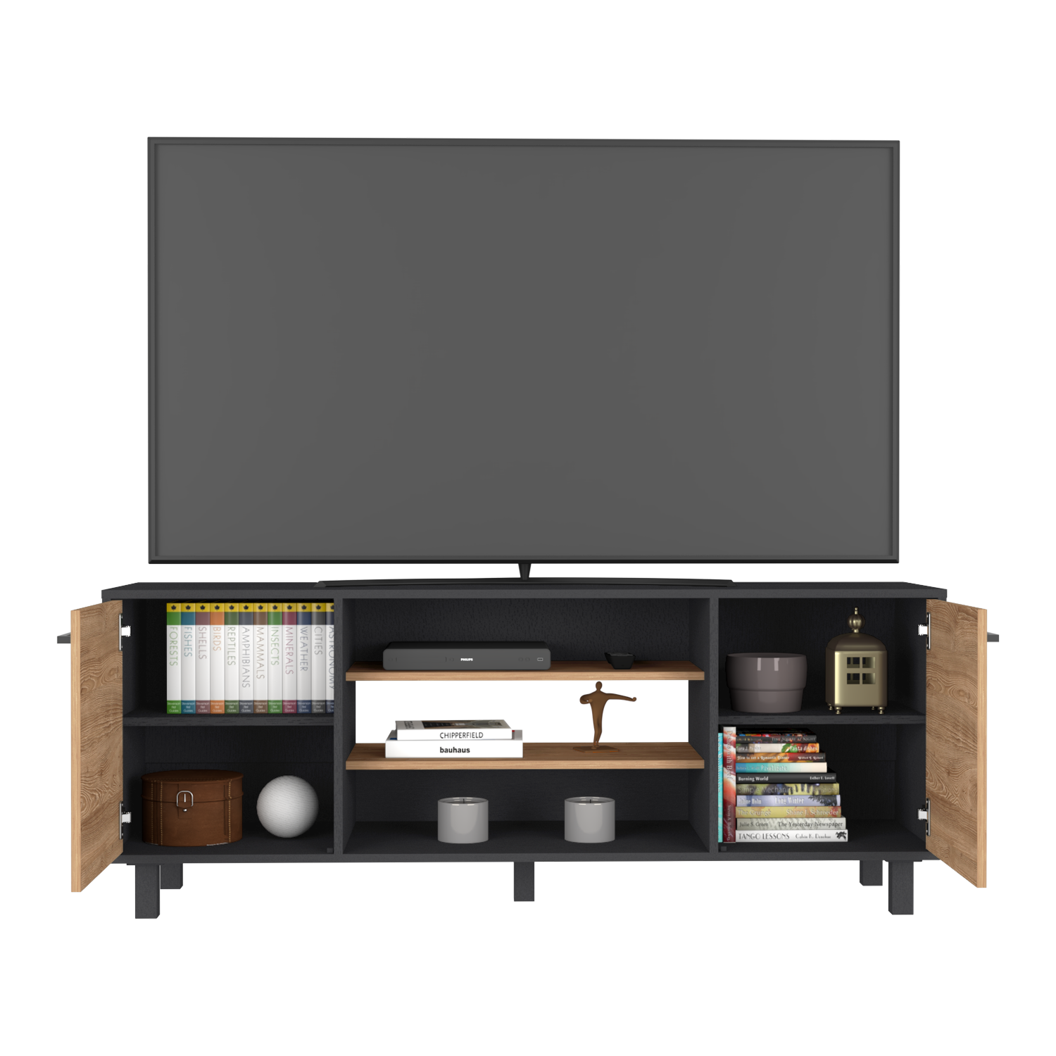 The Washington Tv Stand is the perfect piece for your bedroom or living room. It brings a perfect blend of style and comfort to your space. Your space will have a unique look, and a touch of elegance. Accommodates flat panel TVs up to 65in, features two cabinets with two interior shelves each and lots of room for storage, three open shelves, perfect for devices and displaying decor, designed with Carbon Espresso manufactured wood.